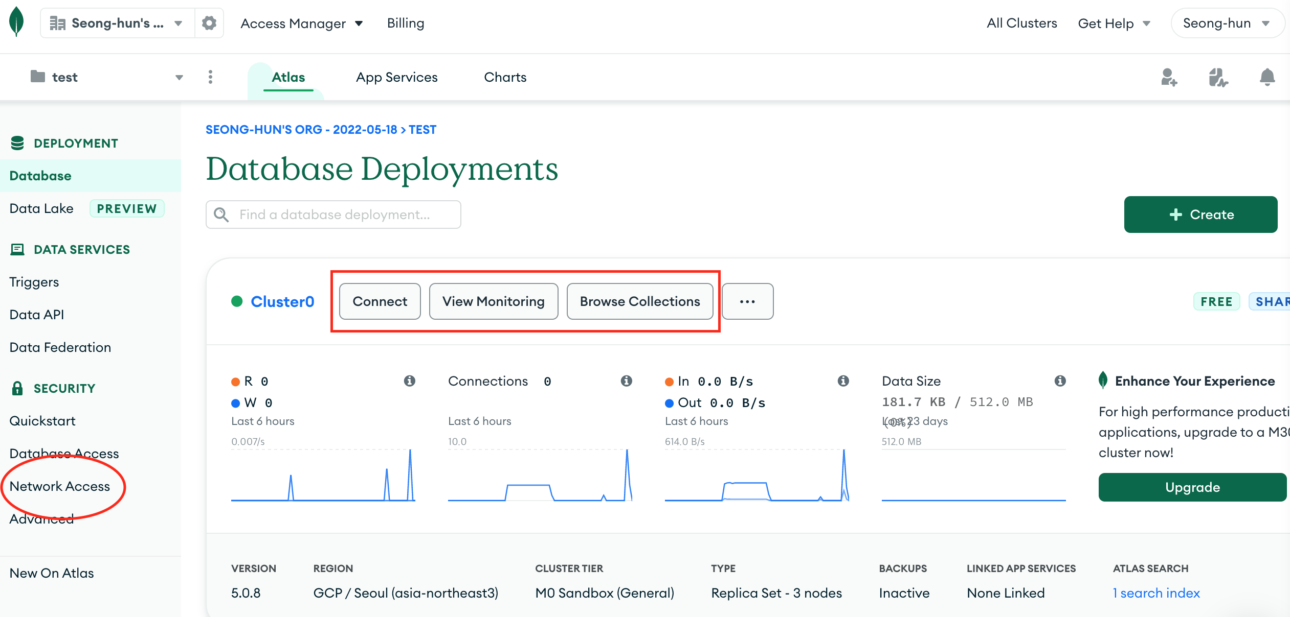 mongodb 사이트에 들어가 구글 아이디로 접속한 후