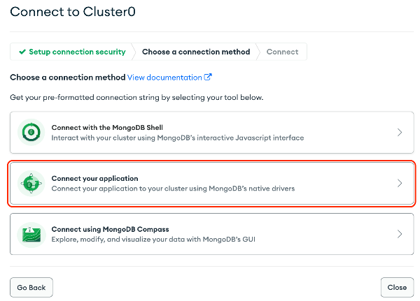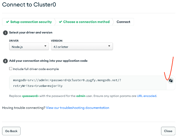 위 db_url 에는 아까 mongodb 메인 화면에서 빨간 네모안의 Connect 를 누르면 나오는 화면에서