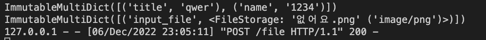 사진과 같이 ImmutableMultiDict가 뜨는것까지 확인을 했다.