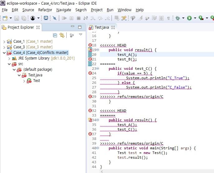Merge하면 위처럼 Conflict된 부분들이 표시된다.