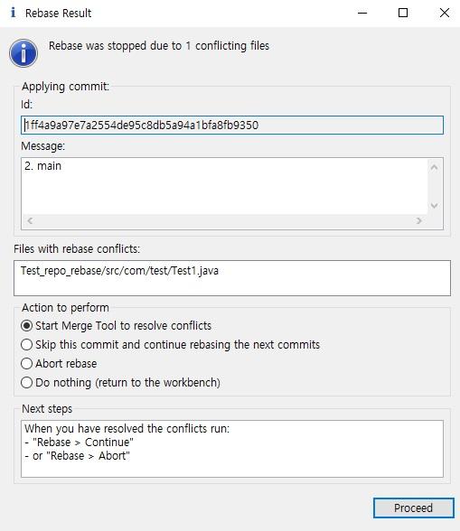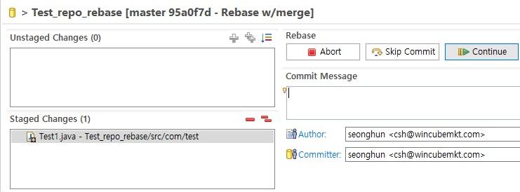 - 해결 후 Git Staging 탭에서 Rebase란에 Continue 클릭