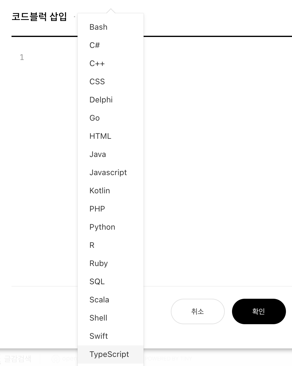 참고로 티스토리에서도 TypeScript 코드블럭을 지원한다.