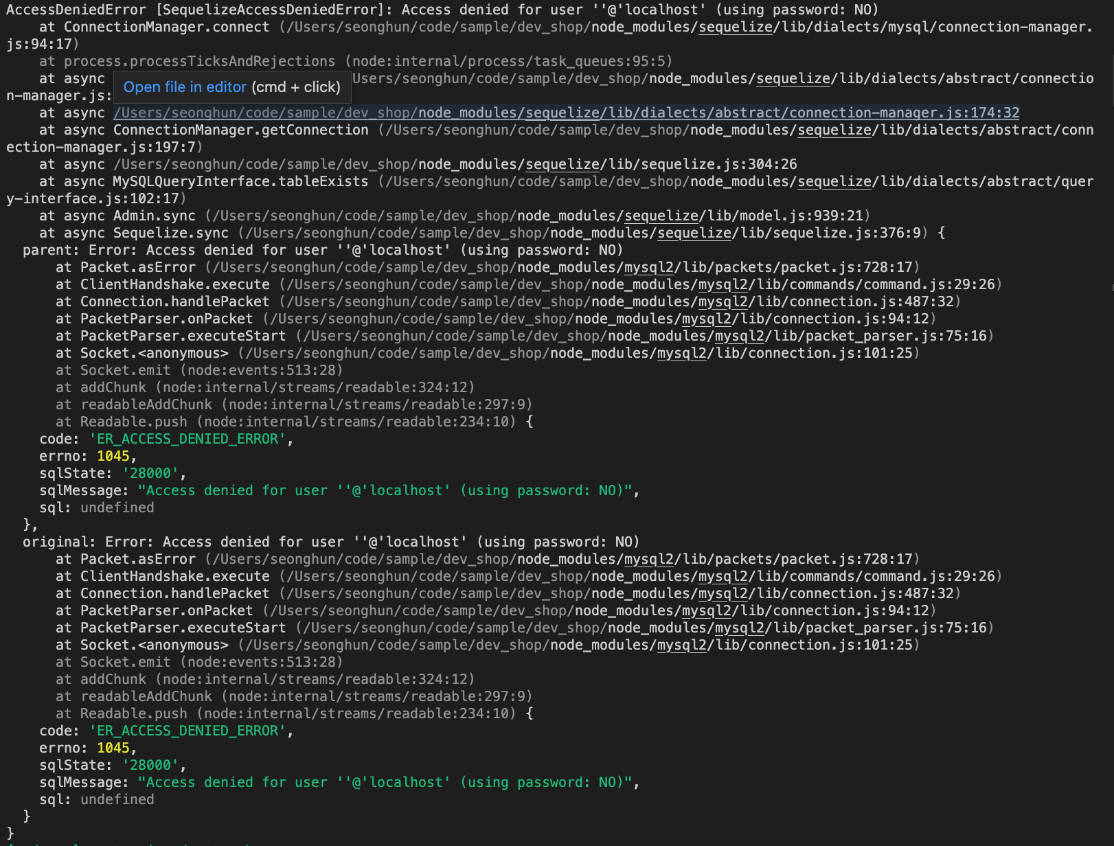 at ConnectionManager.connect (/Users/seonghun/code/sample/dev_shop/node_modules/sequelize/lib/dialects/mysql/connection-manager.js:94:17)