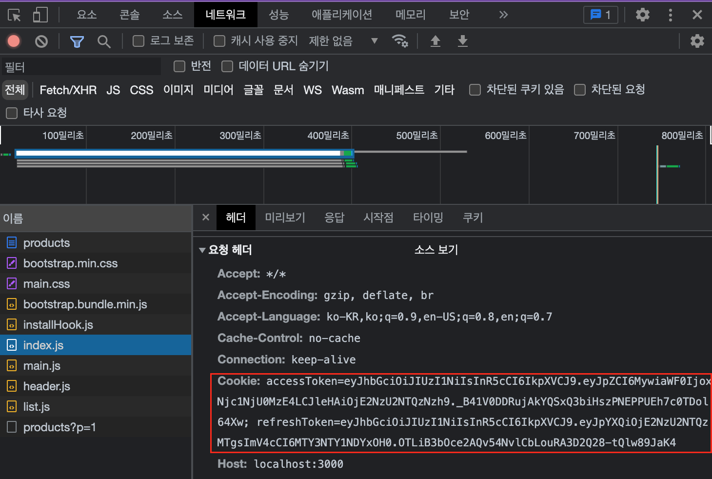 위의 사진처럼 header에 Cookie란 이름으로 accessToken과 refreshToken을 전달하고 있었다.
