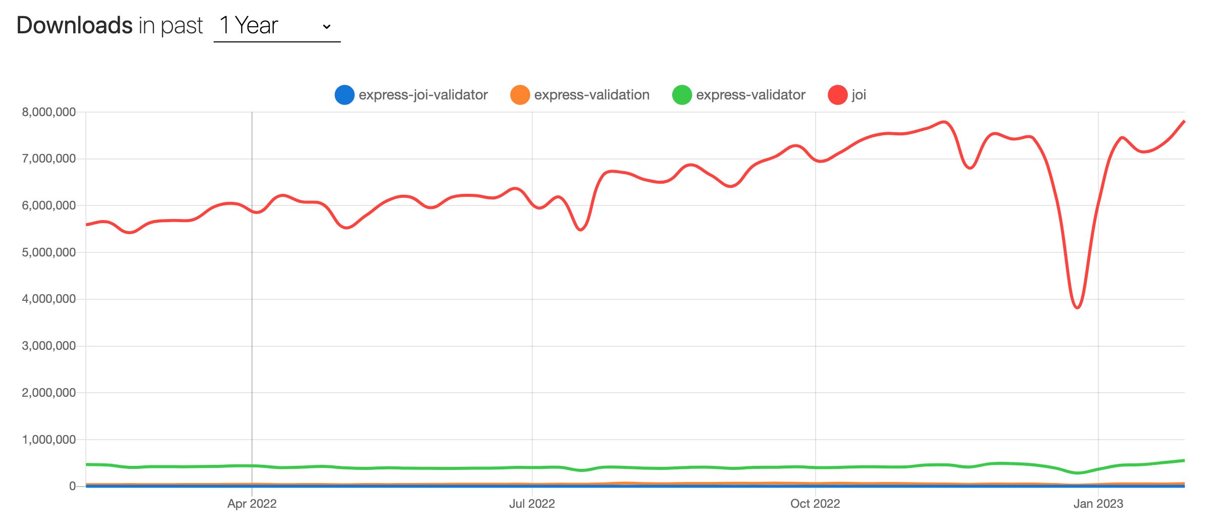 글을 쓰는 시점 기준으로 npm에서 검색했을 때 joi의 다운로드 수가 월등하게 많았는데