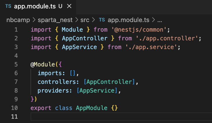 app.module.ts 파일을 열어보면 처음보는 @Module 과 같은 코드를 확인할 수 있는데