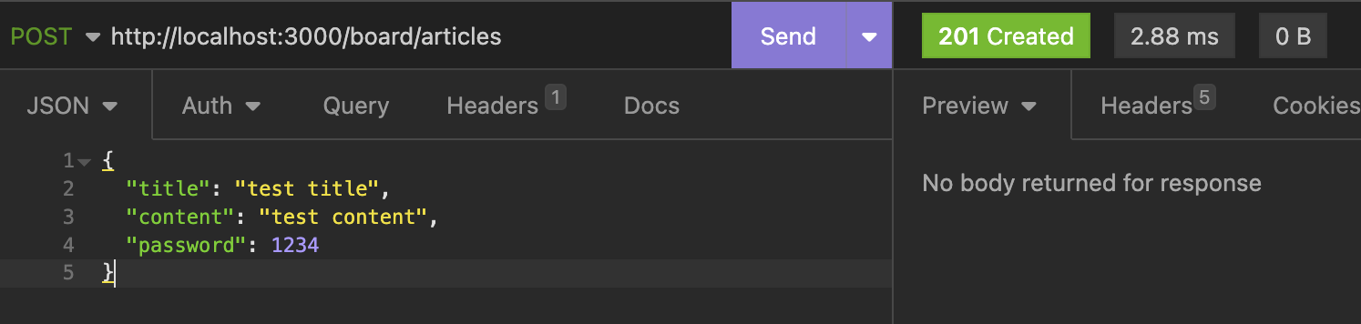 Insomnia에서 테스트해보면 데이터가 잘 들어가는 모습을 볼 수 있다.