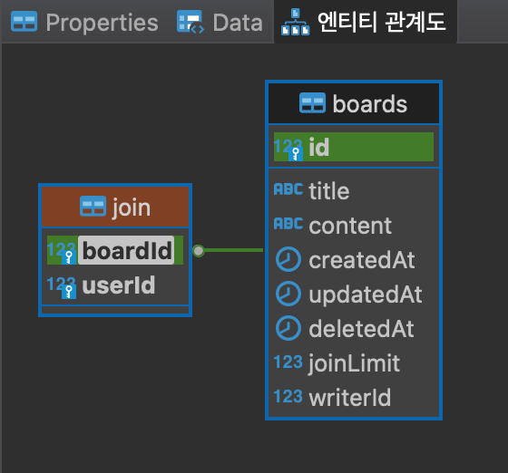 서버 실행 시 Join 테이블쪽에서 종속관계가 형성된 것을 확인할 수 있다.