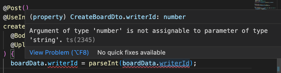 - @IsNumberString()의 영향인지 wrtierId는 number로 취급받고 있음