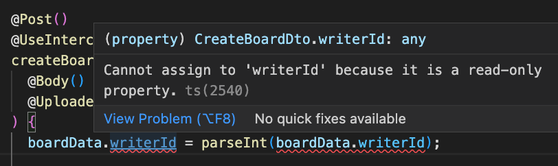 - writerId는 dto에서 readonly로 선언됐기 때문에 변경할 수 없다.