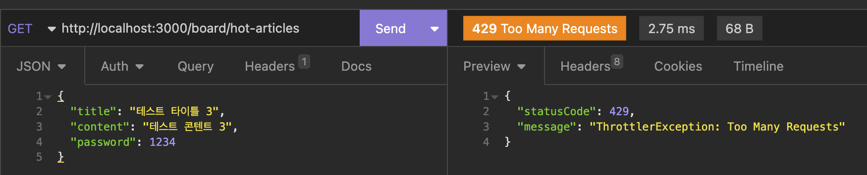 @Throttle(limit, ttl)의 형태로 적용하면 위의 메서드는 60초에 5번까지만 호출이 가능하게 변한다.
