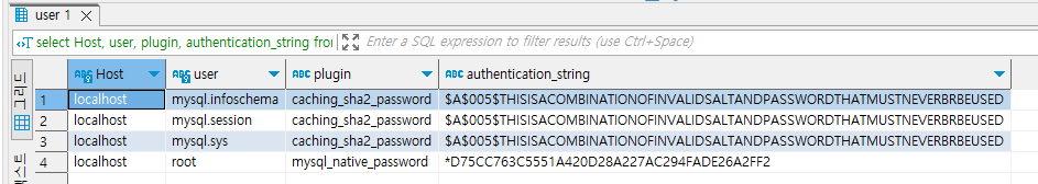 이렇게 authentication_string에서 root만 다르지 않고 모두 같을 경우가 내 경우에 해당한다.
