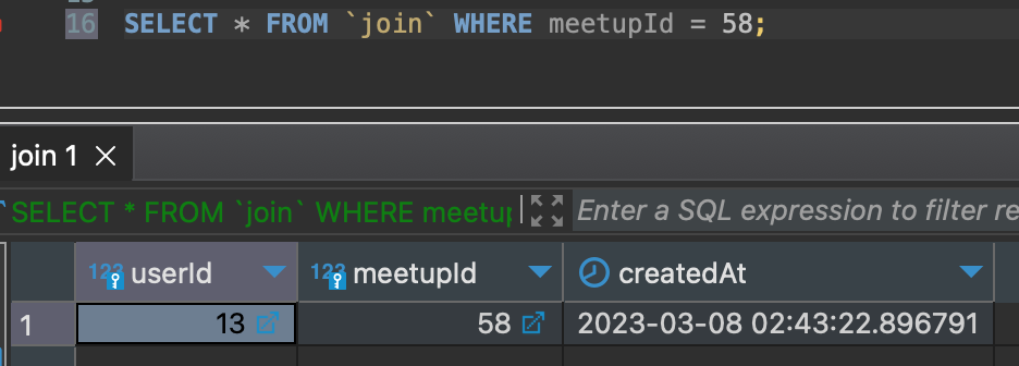 참여를 시도하면 DB join 테이블에 meetupId 58에 대해 주최자 id인 13을 제외한