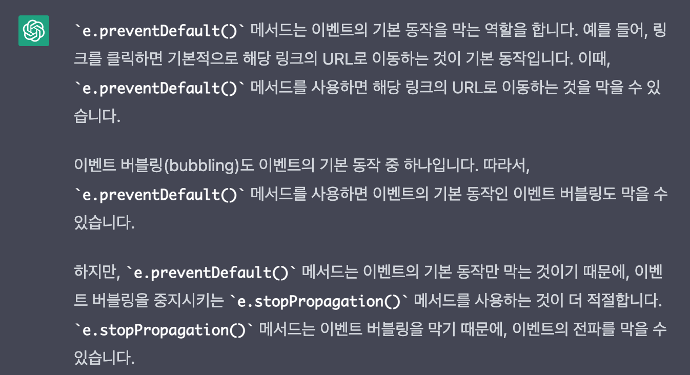 ChatGPT에 물어본 건 이벤트 버블링 상황에서 e.preventDefault() 가 정확히 뭘 하냐였는데