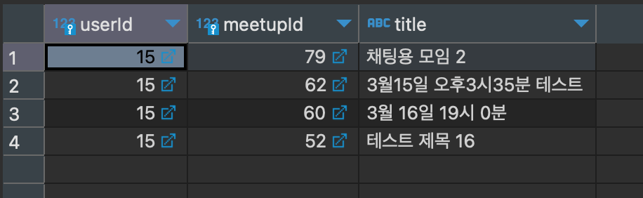 그 결과 내가 바란대로 참여중인 meetupId만 가져왔다.