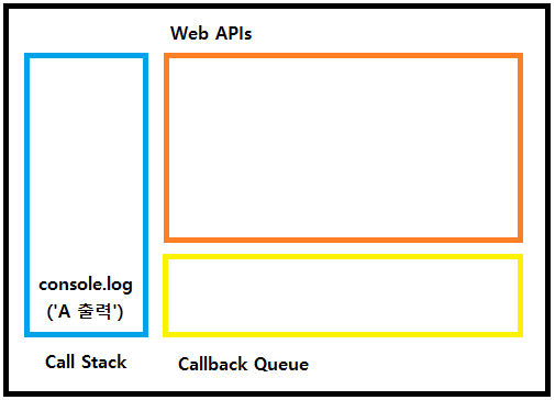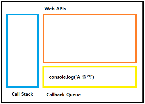 그동안 setTimeOut()의 2초가 지나 콜백 함수인 console.log('A 출력')이 Callback Queue에 들어가