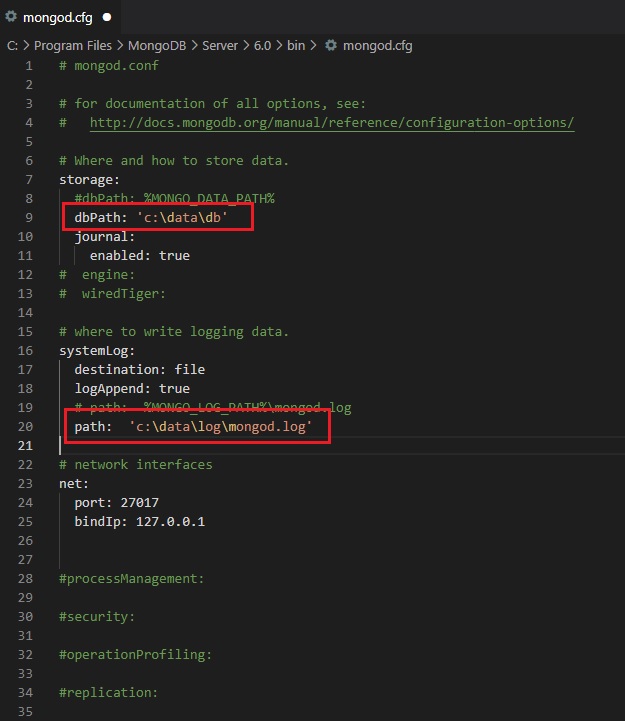 mongod.exe 파일 있던 폴더에 mongod.cfg가 있는데 vscode 등으로 열어서 아래와 같이 수정
