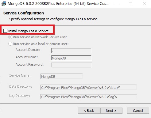 추후 GUI를 통해 사용하기 위해 Install MongoDB Compass 항목에 체크 후 Next 하면서 설치를 완료하자.
