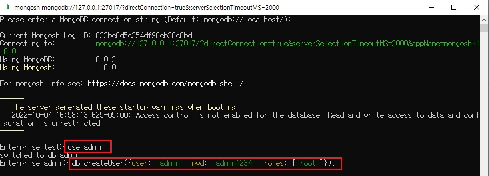 이제 마지막으로 어드민 권한을 설정하여 몽고디비 접속에 보안을 강화해보자
