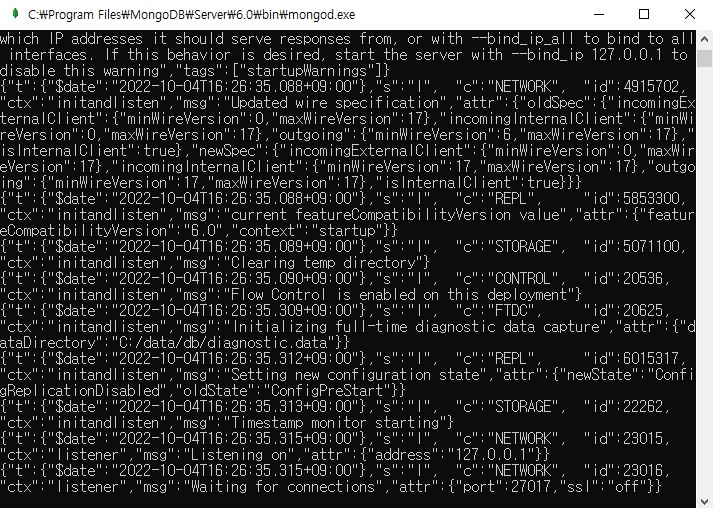 설치완료 후 설치경로로 가서 Mongod.exe를 실행시켜주면 아래와 같은 도스창이 뜨며 몽고디비 서버가 실행된다.