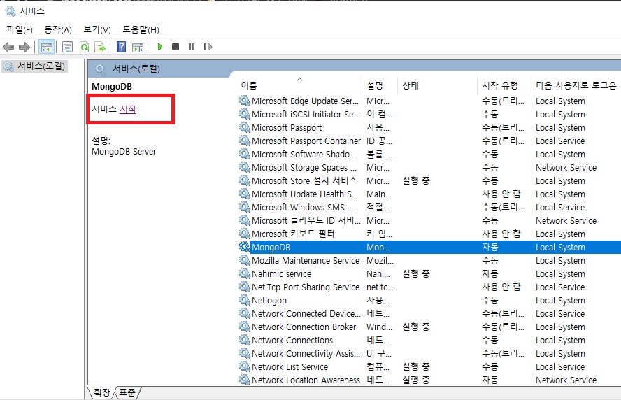 윈도우 검색으로 서비스 들어가서 m 누르고 MongoDB가 위처럼 저렇게 있나 확인. 실행중이 아닐테니