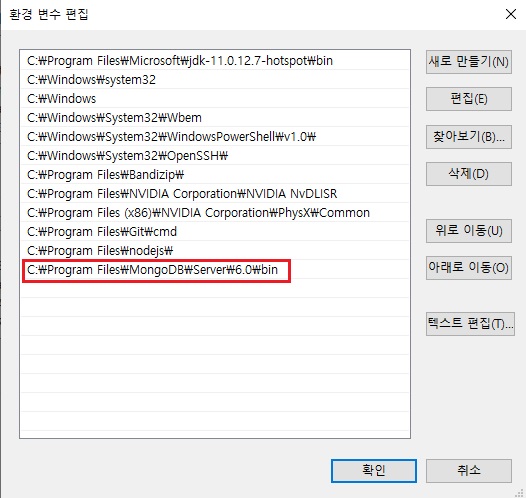 사진처럼 bin 폴더 세팅해놓고 확인 눌러서 다 끄면 이제 cmd에서 mongod만 입력해도 몽고디비 서버가 실행된다.