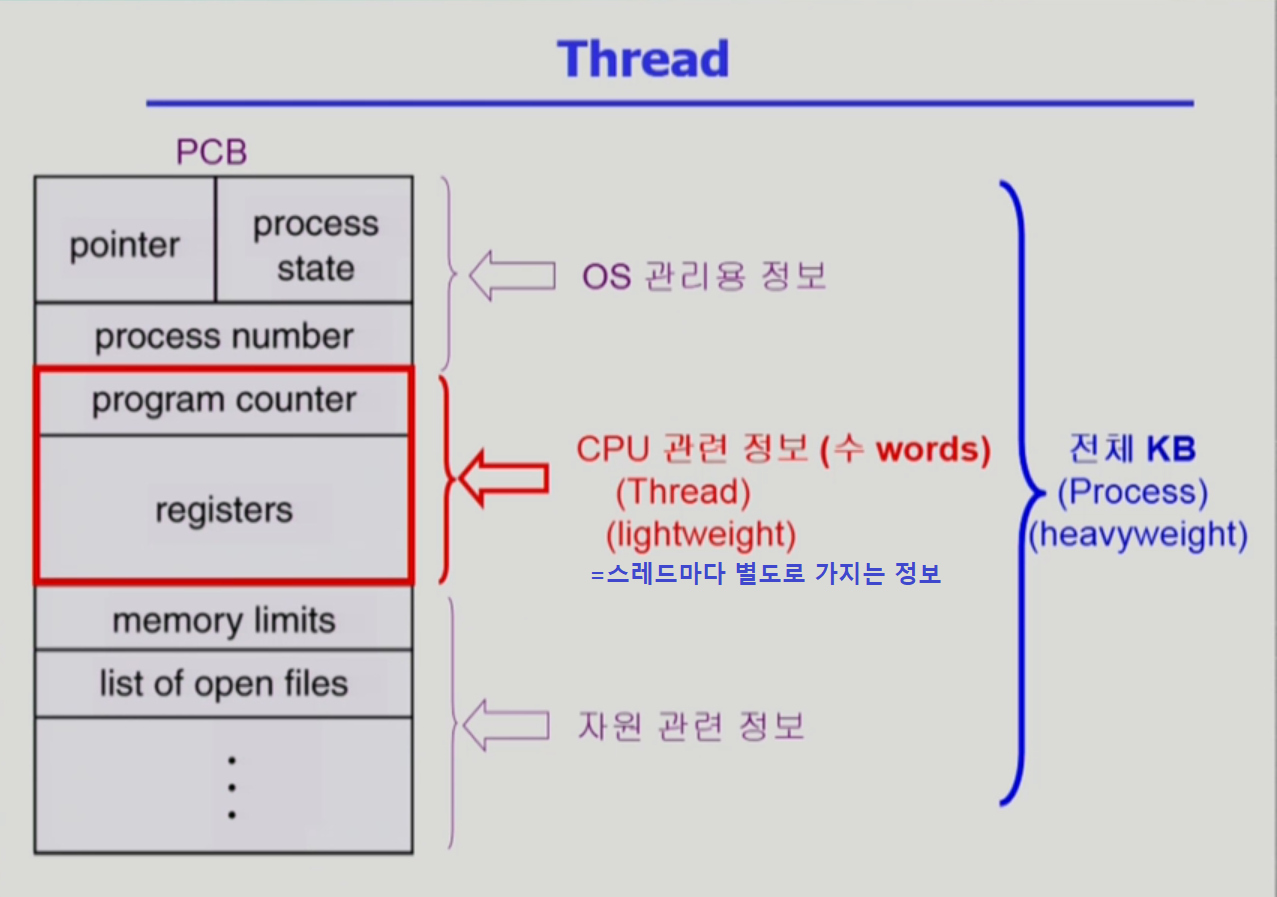 - 프로세스 안에 스레드가 여러 개 있다는 사실을 운영체제가 알고 있음