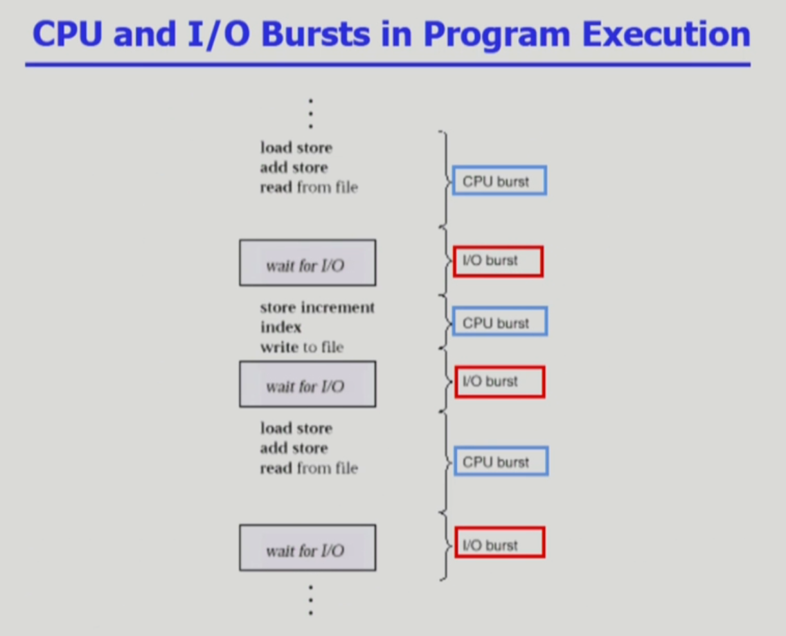 어떤 프로그램이든 프로그램이 실행된다는 것은 CPU burst와 I/O burst를 반복하며 실행된다.