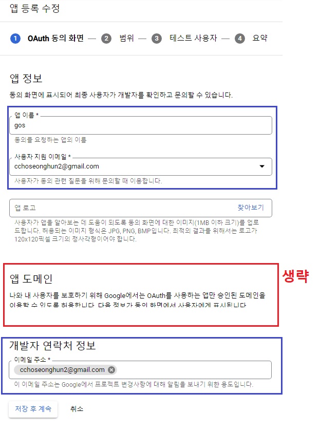 여기서 앱 이름에 프로젝트명과 같은 google-oauth-sample을 쓰고 싶었는데