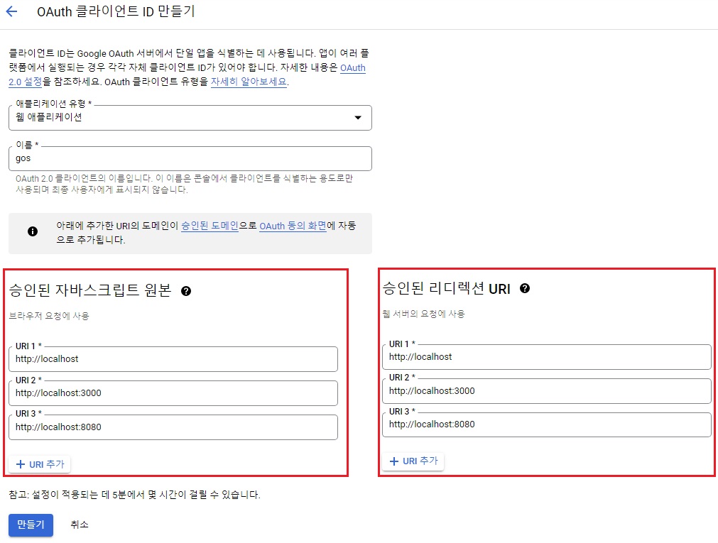 승인된 리디렉션 URI에 각각 사진과 같이 URI를 입력해준다.