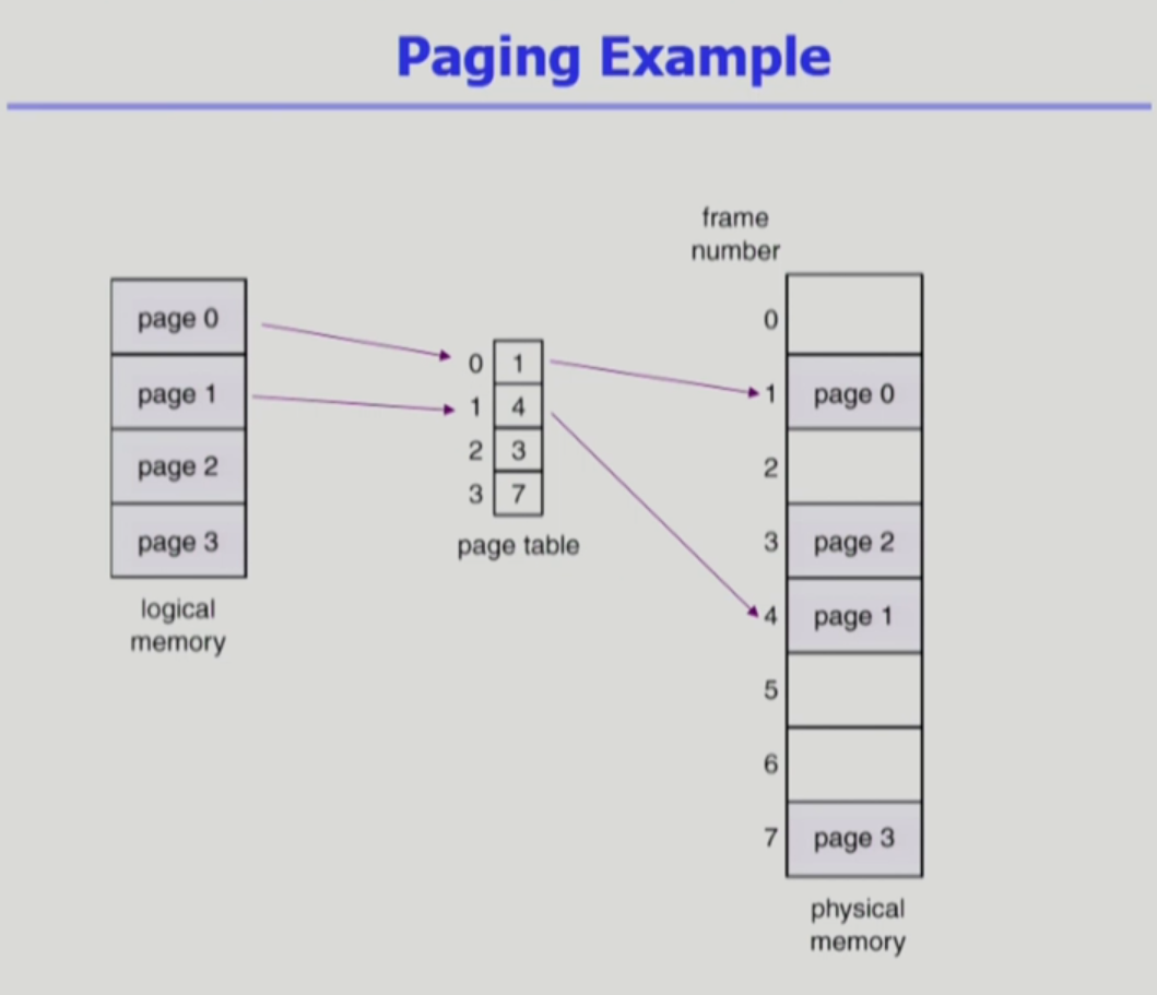 page table을 사용하여 logical address를 physical address로 변환 - 같은 크기로 잘라놨기 때문에 External fragmentation이 발생하지 않음