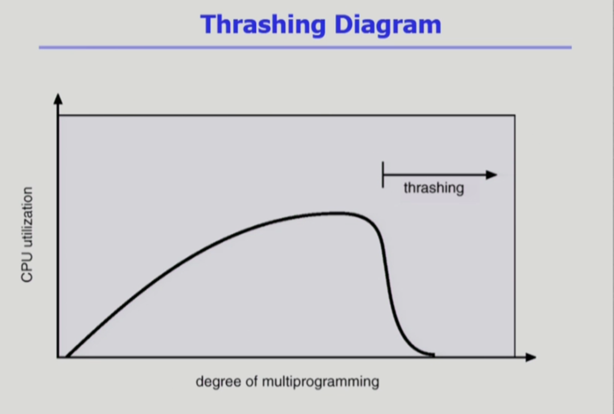 - 어떤 프로그램한테 최소 메모리도 할당이 안됐을 때 page fault가 전체 시스템에서 아주 빈번히 발생하는 상황을