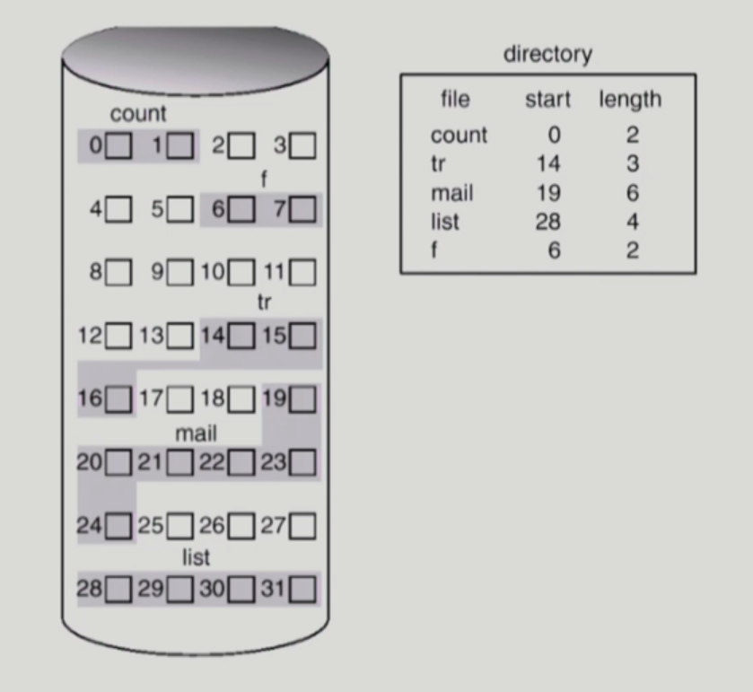 - 하나의 file이 disk 상에 연속해서 저장되는 방법