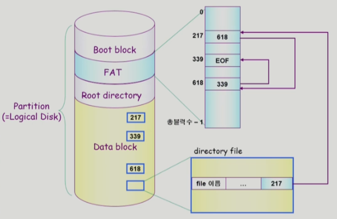 - FAT에는 해당 블록의 다음 블록을 번호로 저장