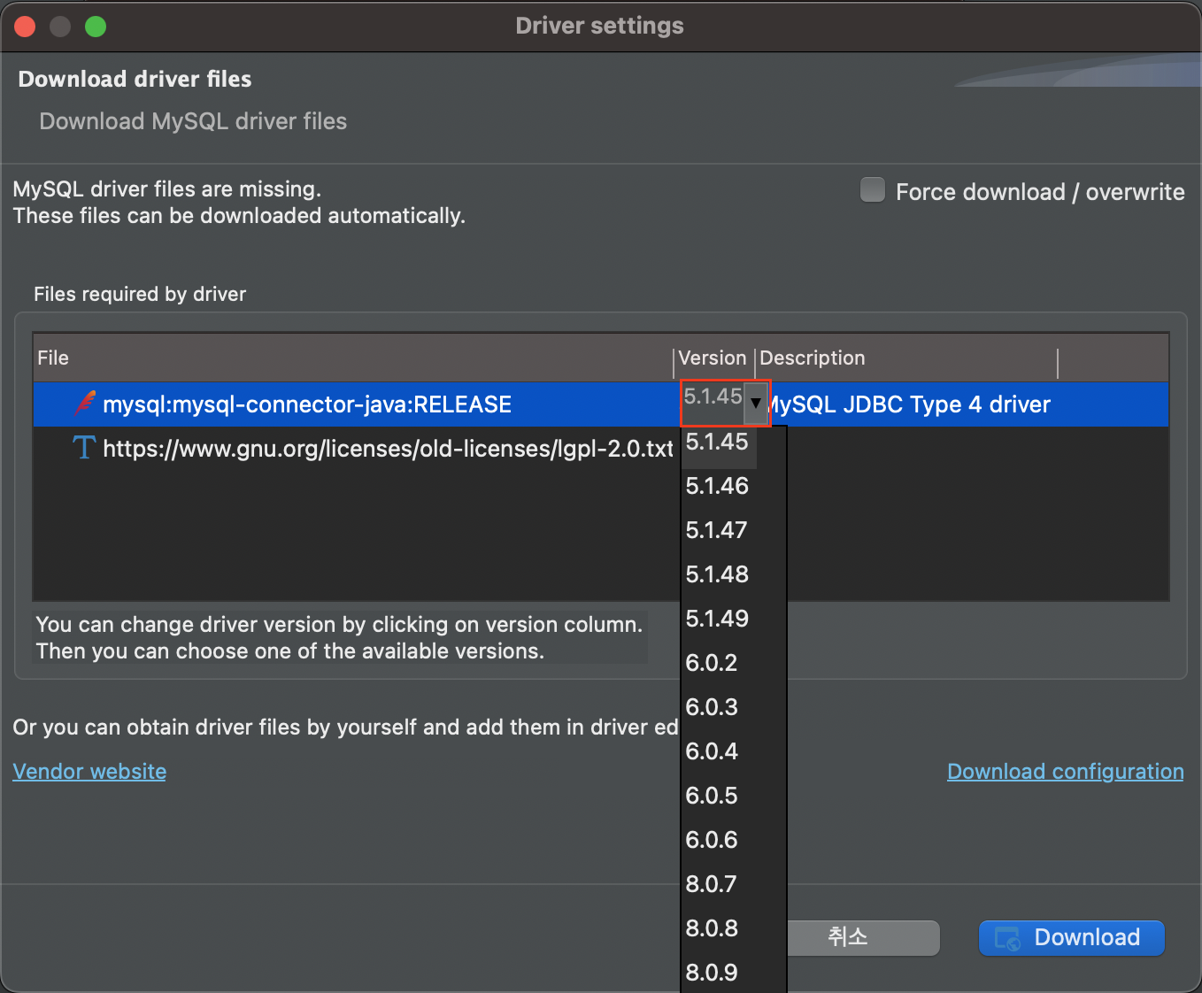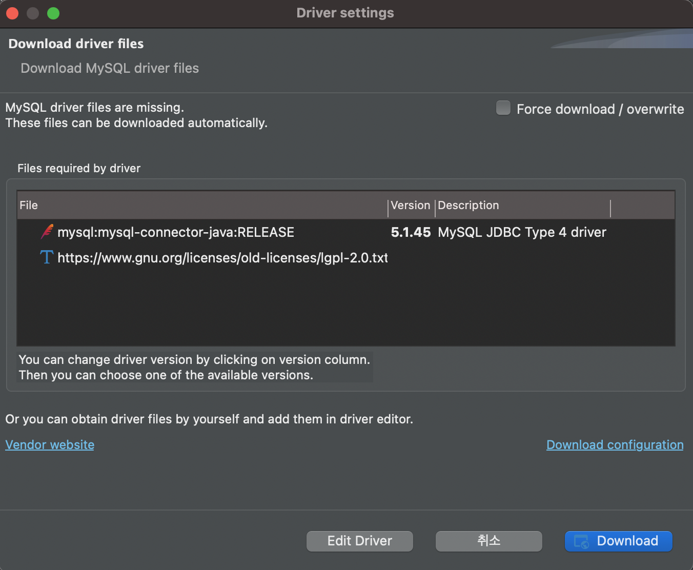 이후 접속 정보 입력 후 Test Connection을 진행하면 위와 같이 Download 하라고 나오고 진행 시