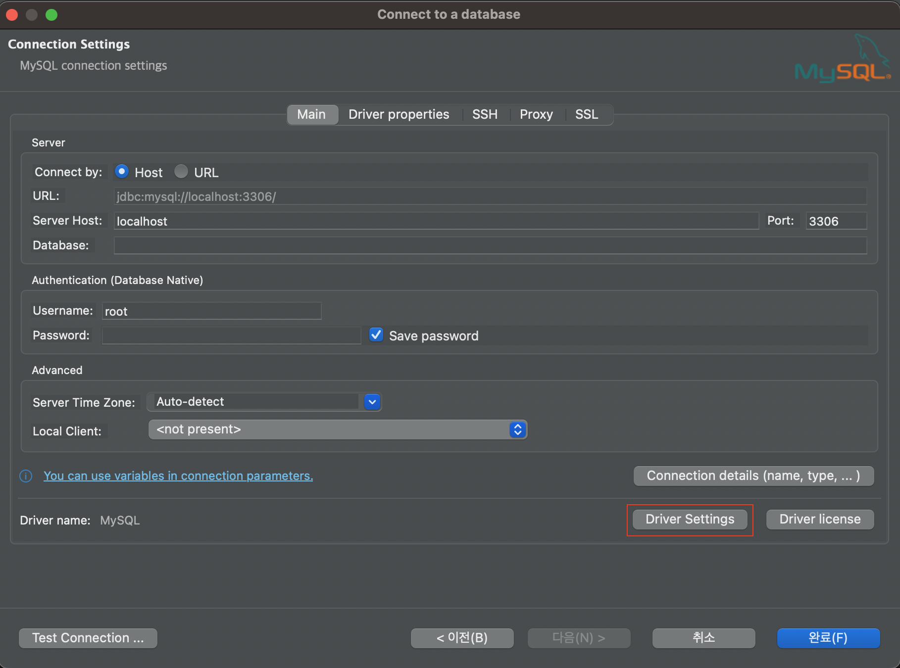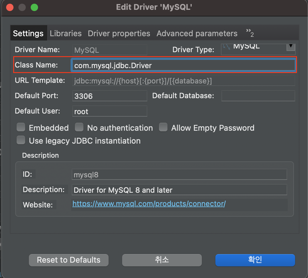 이후 Settings 탭으로 가서 Class Name이 아마 com.mysql.cj.jdbc.Driver로 되어 있을건데