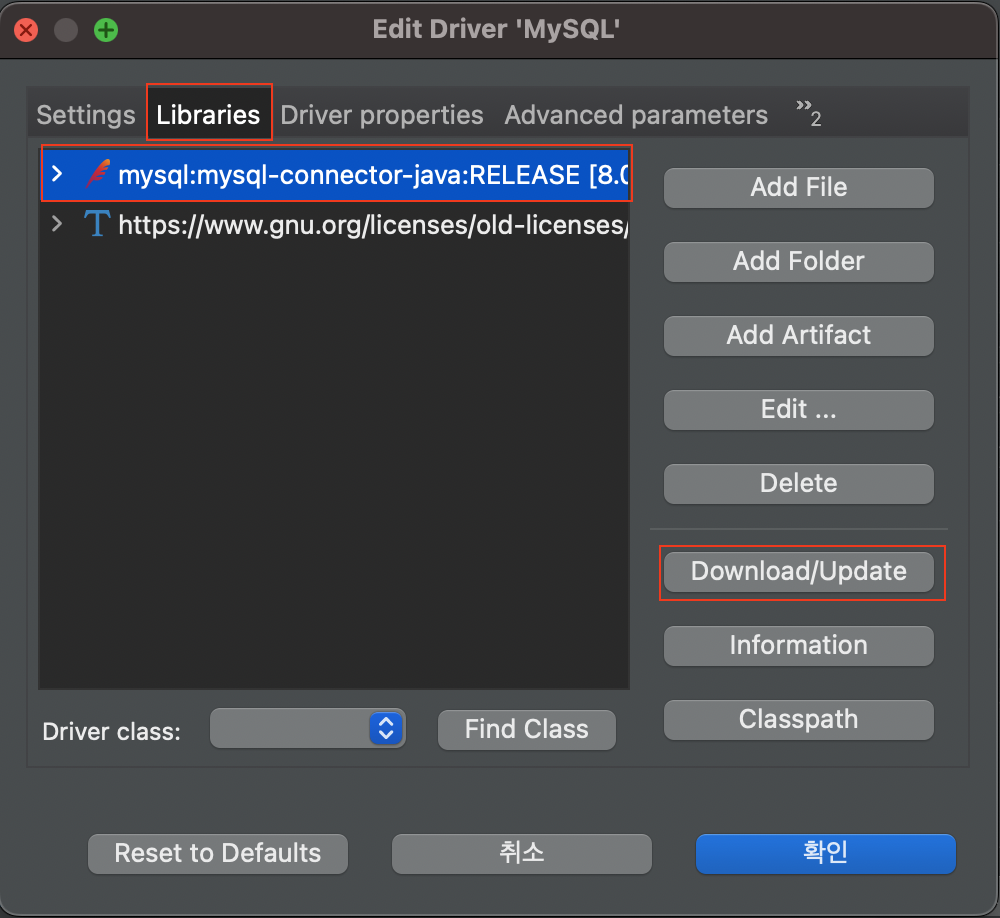 들어간 후 Libraries에서 mysql-connector-java 클릭 후 Download/Update 클릭