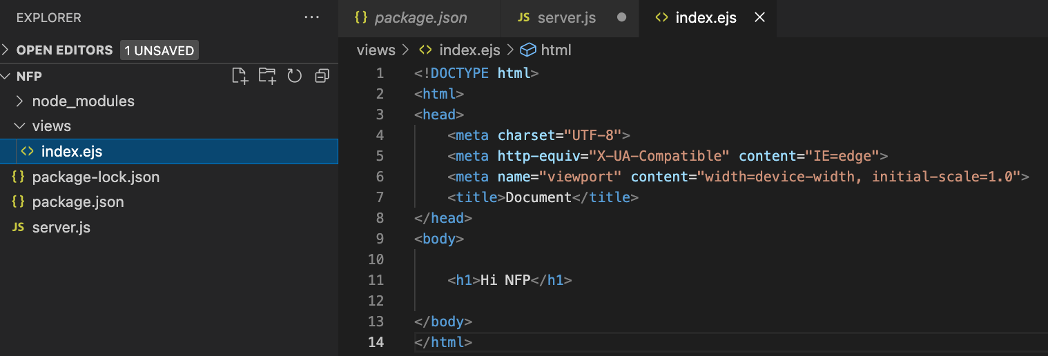 nfp 프로젝트에 views 폴더를 만들고 메인페이지를 위한 index.ejs 파일을 만든다.